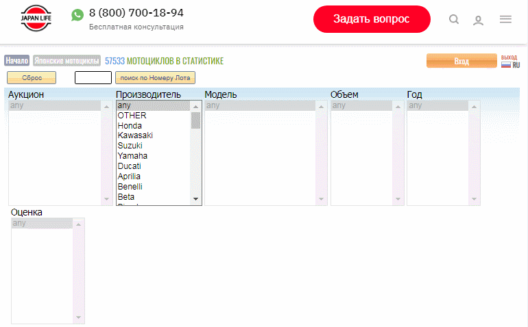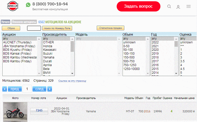 Помочь с покупкой и доставкой мотоциклов с аукционов Японии вам может компания Japan Life. Вы можете самостоятельно искать интересующие вас лоты или доверить эту задачу нам — ставки на аукционах будут от вашего имени, но от сотрудника, имеющего регистрацию на конкретной площадке. Мы предоставляем возможность приобрести любой байк и сами организовываем доставку до японского порта, а затем — в Россию.